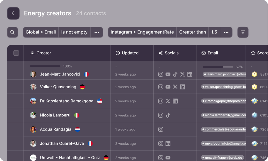 Enriched data includes a "last updated" timestamp so you always know how recent the information is. If a profile looks stale, you can re-enrich it to pull the latest stats and contact details. This is useful for creators whose audiences or platforms shift quickly.