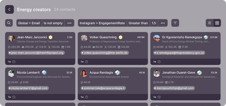 Filter contacts on any anything, including performance, platform, and custom data to quickly spot creators aligned with your campaign goals.