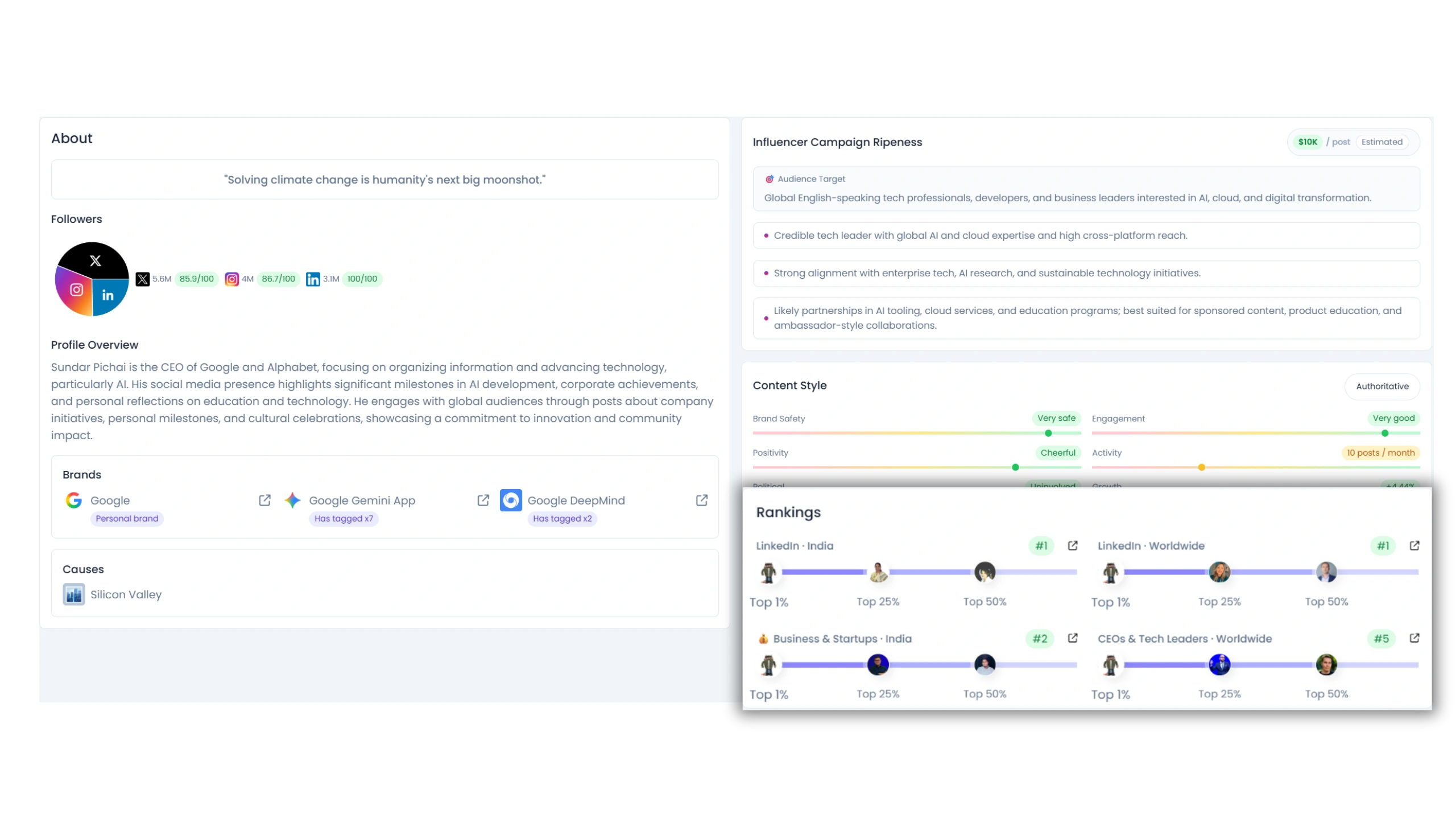 A plataforma se tornou uma ferramenta confiável para criadores e marcas, com mais de 150.000 classificações em tempo real em mais de 600 nichos, cobrindo mais de 150 países em todo o mundo.