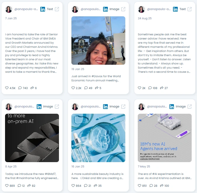 O conteúdo de Ana é a combinação perfeita de inteligência e autenticidade. Ela comunica assuntos complexos, como implementação de IA e transformação corporativa, de uma forma que parece pessoal e inspiradora. Suas postagens geralmente incluem reflexões de conferências como o Fórum Econômico Mundial ou conclusões pessoais de momentos de liderança, tornando sua voz acessível. Ela incentiva os profissionais a serem visionários e fundamentados, uma qualidade que mantém seu público profundamente engajado.