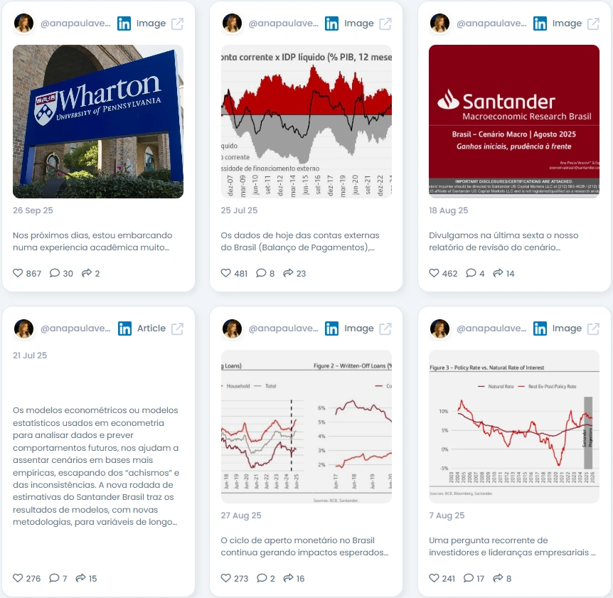 A análise de Ana Paula potencializa os relatórios macro e os briefings executivos do Santander. Ela faz parcerias com meios de comunicação para decodificar mudanças políticas para um público amplo. Programas e fóruns acadêmicos a convidam a levar a perspectiva do Brasil para salas globais. O resultado é um conteúdo consistente e de alto sinal para os tomadores de decisão.