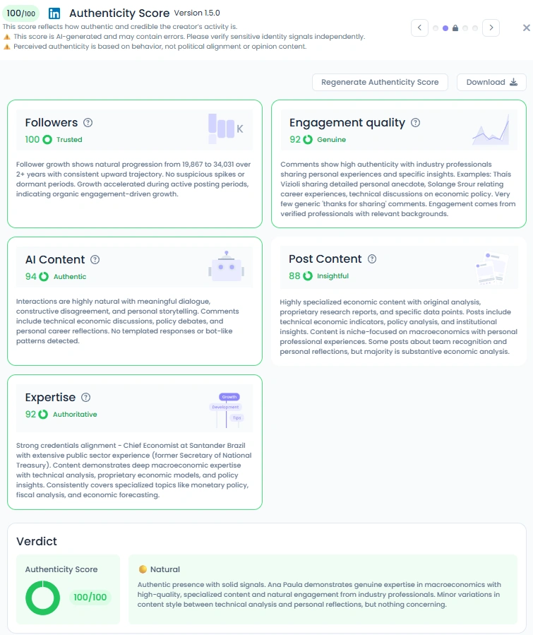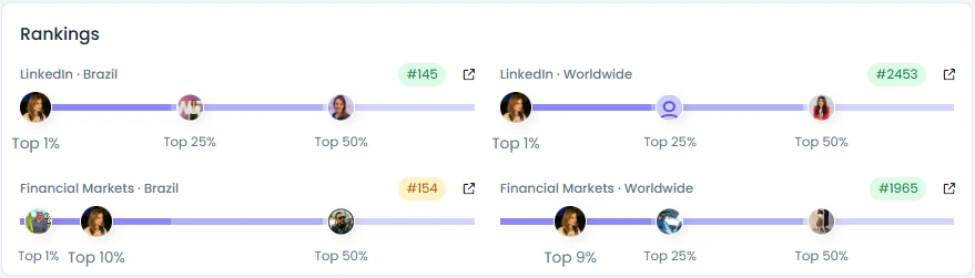 Ela alcança cerca de 34,1 mil no LinkedIn, com crescimento constante e bom engajamento. O Influence Score fica em torno de 6.469 pontos. A atividade tem uma média de quatro publicações por mês, cada uma com base em dados ou em um novo relatório. Os rankings a colocam no top 1% do LinkedIn no Brasil (#145) e no top 10% no Financial Markets Brazil (#154).