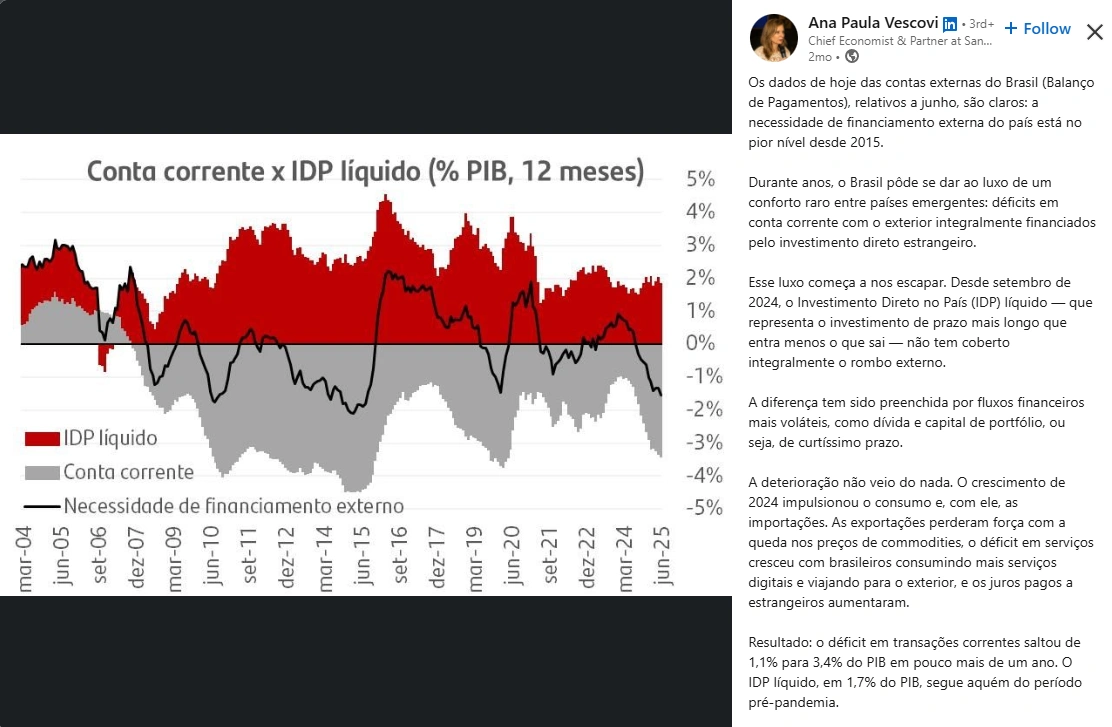 Sua rede abrange o Santander, a Folha de S.Paulo, a academia e vozes seniores no governo e nos negócios. Ela envolve economistas, CFOs e formuladores de políticas que moldam o debate no Brasil. Os relatórios percorrem a mídia financeira e as salas de reuniões. A combinação lhe dá credibilidade tanto com instituições quanto com operadoras.
