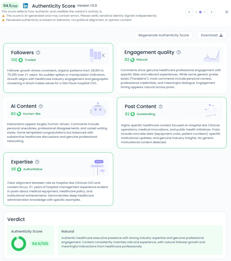 Os seguidores cresceram de 28.961 para 75.295 em dois anos, com tendências saudáveis e orgânicas. Sua pontuação de influência é de 7.329 pontos. A qualidade do engajamento chega a 82, a publicação de conteúdo a 92 e a experiência a 95. Os rankings o colocam em #31 no Brasil no LinkedIn e no Top 3% do mundo entre especialistas em tecnologia e saúde.