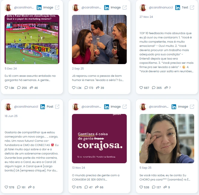 Carolina é direta e humana. Ela mostra a vitória e a lição por trás dela. Ela brinca sobre mitos do escritório, compartilha o feedback que ouviu e convida ao debate sem drama. O tom é amigável, as conclusões são claras e os comentários se transformam em conversas.