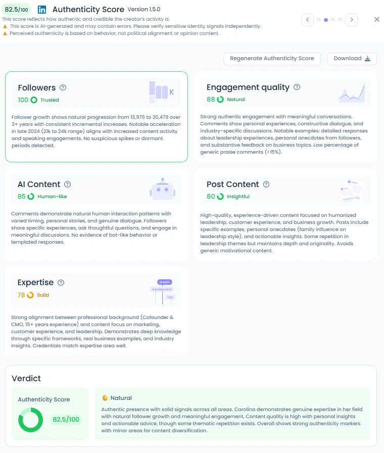 Sua pontuação de autenticidade do Favikon é 82,5/100. Os comentários parecem naturais, com horários variados e histórias pessoais. O conteúdo se concentra em casos reais de liderança e experiência do cliente. Ela evita a motivação genérica e a mantém prática. A franqueza e o humor facilitam a confiança nos conselhos.