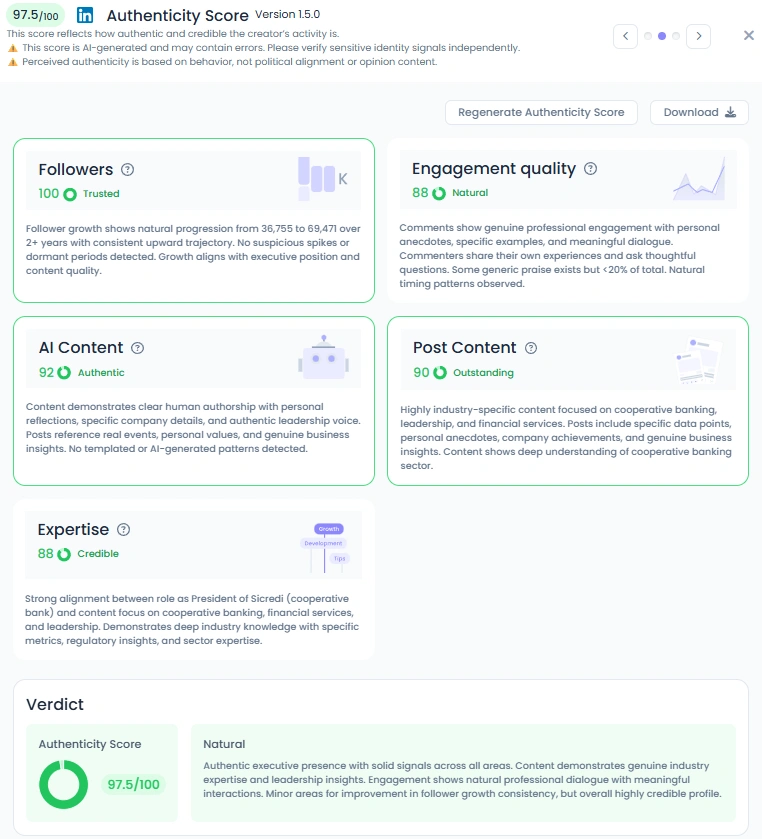 Com uma pontuação de autenticidade de Favikon de 97,5/100, o conteúdo de César incorpora confiança e transparência. Suas postagens destacam a cultura interna, os princípios cooperativos e o progresso mensurável do Sicredi, sempre apoiados por dados reais e reflexão pessoal. Cada atualização combina visão profissional com conexão humana, desde a celebração das conquistas dos funcionários até a promoção da aprendizagem ao longo da vida. Seu estilo natural de escrita e tom genuíno provam que os líderes corporativos podem inspirar sem parecer corporativos.