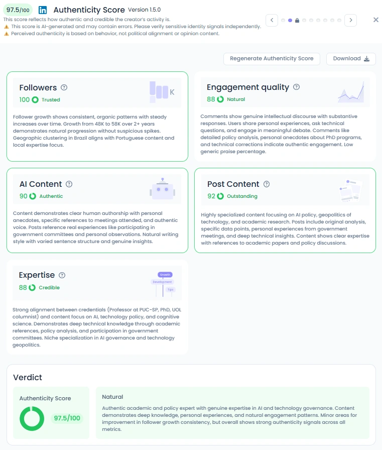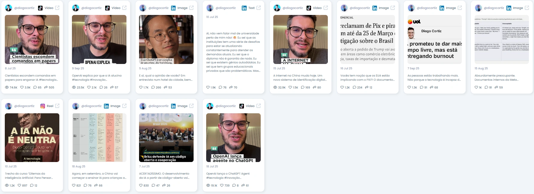 Com uma pontuação de autenticidade de 97,5/100, Diogo mostra que experiência e personalidade podem andar de mãos dadas. Suas postagens geralmente incluem reflexões pessoais sobre a vida acadêmica, momentos de conferências e até opiniões fortes sobre erros políticos. Essa mistura de autoridade e abertura torna seu conteúdo confiável e acessível.