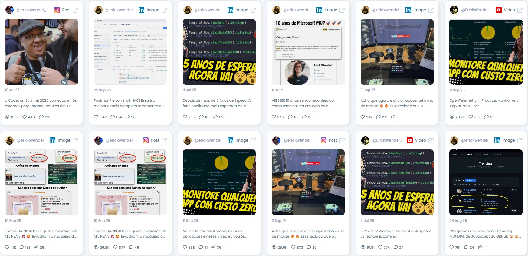 As pessoas se sintonizam com Erick por causa de seu estilo de ensino único. Seu conteúdo combina profundidade técnica com humor, demonstrações práticas e narrativa acessível. Os desenvolvedores confiam nele porque ele compartilha histórias de sucesso e desafios, tornando seu conteúdo identificável. Seja lançando uma nova atualização do JavaScript ou reagindo a um grande hack, suas postagens parecem autênticas e úteis.