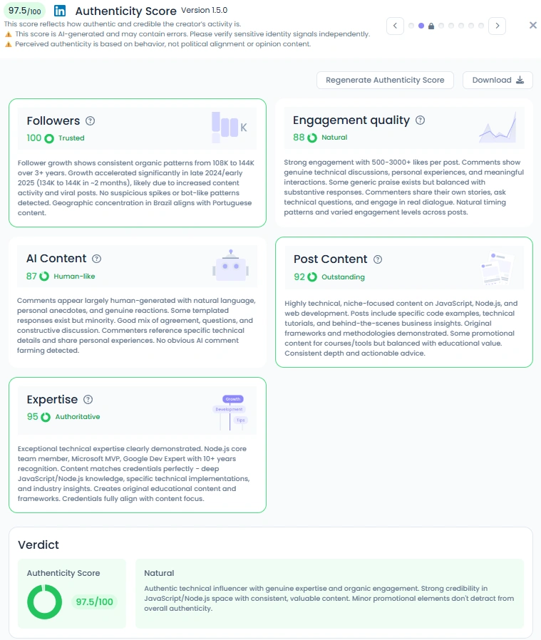 Com uma pontuação de autenticidade de 97,5/100, Erick mostra que até mesmo conteúdo altamente técnico pode parecer humano. Ele mistura histórias pessoais com dicas práticas de codificação, dando aos seguidores uma sensação de conexão além da tela. Suas postagens geralmente geram discussões genuínas, desde debates sobre estruturas até dificuldades compartilhadas entre desenvolvedores. Esse equilíbrio entre autoridade e abertura é o motivo pelo qual seu público permanece fiel e engajado.