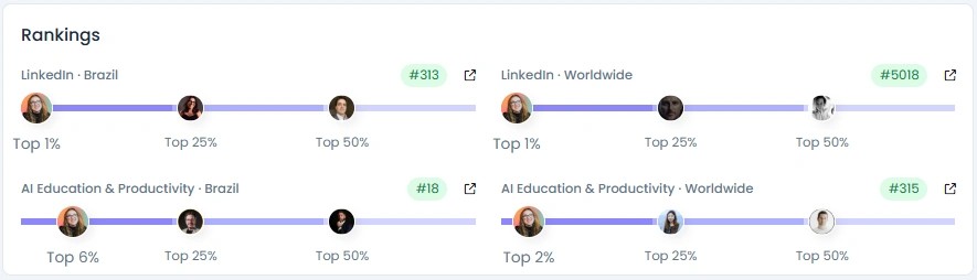 Gio tem uma pontuação de influência de 7.641 pontos, colocando-a entre os 6% melhores criadores do LinkedIn no Brasil e os 2% melhores do mundo em educação e produtividade em IA. Suas postagens alcançam regularmente dezenas de milhares de visualizações, com um Índice de Qualidade de Engajamento de 88/100. Ela mantém um ritmo ativo de publicações educacionais, análises de ferramentas e atualizações pessoais que geram discussões significativas de forma consistente. Sua combinação de explicadores visuais e insights pessoais faz com que o público volte para saber mais.