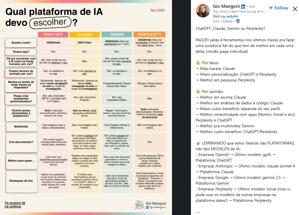 Gio Mangoni rapidamente se tornou um dos educadores mais confiáveis do Brasil na área de IA. Com seu tom amigável e estilo de ensino claro, ela preenche a lacuna entre a tecnologia complexa e o uso no mundo real.