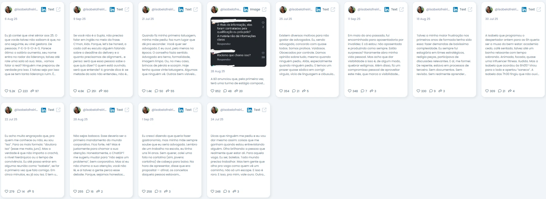 Isabela é especialista em direito trabalhista e líder de equipe jurídica conhecida por sua assessoria estratégica que coloca as pessoas em primeiro lugar. Ela construiu sua reputação compartilhando momentos reais da vida corporativa e da prática trabalhista brasileira, desde erros de integração até pontos cegos gerenciais. Suas postagens parecem conversas no corredor, mas carregam o peso de uma gerente jurídica experiente. Os marcos incluem orientar equipes em questões de conformidade de alto risco e orientar jovens profissionais que assumem funções estratégicas. Ela se posiciona como tradutora entre a lei e o trabalho diário, sempre buscando clareza e dignidade no trabalho.