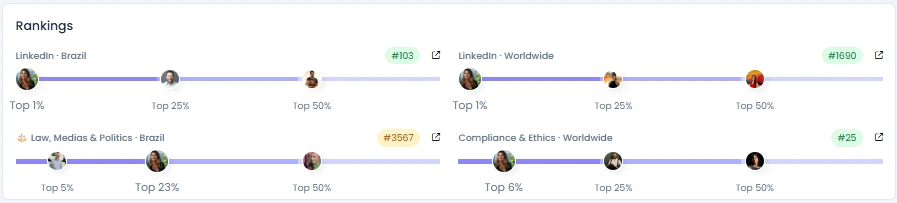 Seu círculo está enraizado no cenário corporativo do Brasil. Você encontrará executivos, líderes de RH e profissionais jurídicos interagindo com seus tópicos. As marcas ao seu redor incluem players do mercado financeiro, como a B3, consultorias respeitadas e mídias de negócios que moldam as conversas executivas. A rede pode parecer fraca, mas o sinal é forte e direcionado.