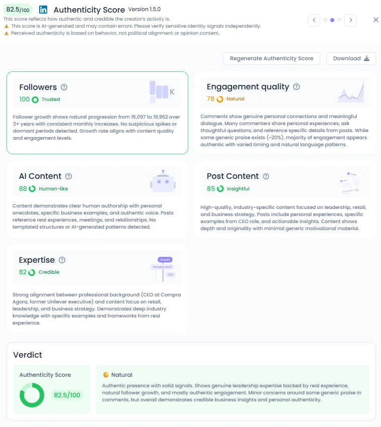 Com uma pontuação de autenticidade de Favikon de 82,5/100, a presença de Julio parece natural e confiável. Suas postagens mostram a pessoa real por trás do título de CEO, desde fotos antigas até reflexões sobre erros e crescimento. Os números provam isso: seu conteúdo é 88% humano, 85% esclarecedor e baseado em experiência confiável. Ele escreve enquanto lidera, com convicção, clareza e um toque de humor, mostrando que a autenticidade é sua estratégia de negócios mais poderosa.