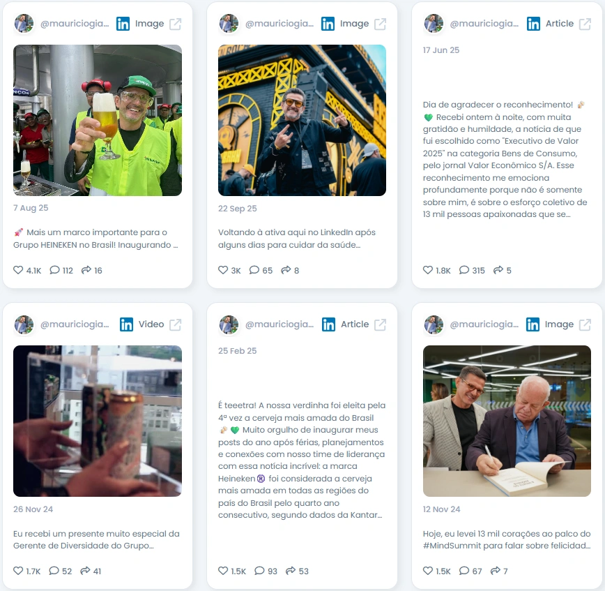 Mauricio tem uma pontuação de autenticidade de Favikon de 100/100, o que diz tudo. Seu conteúdo parece natural, não está preparado para ser perfeito. Seja falando com trabalhadores da fábrica ou refletindo sobre as conquistas de sua empresa, ele mostra o lado humano da liderança. Seu engajamento é impulsionado por conversas genuínas, não por métricas. Os seguidores apreciam seu equilíbrio entre profissionalismo e cordialidade, fazendo dele uma voz confiável na comunidade empresarial brasileira.