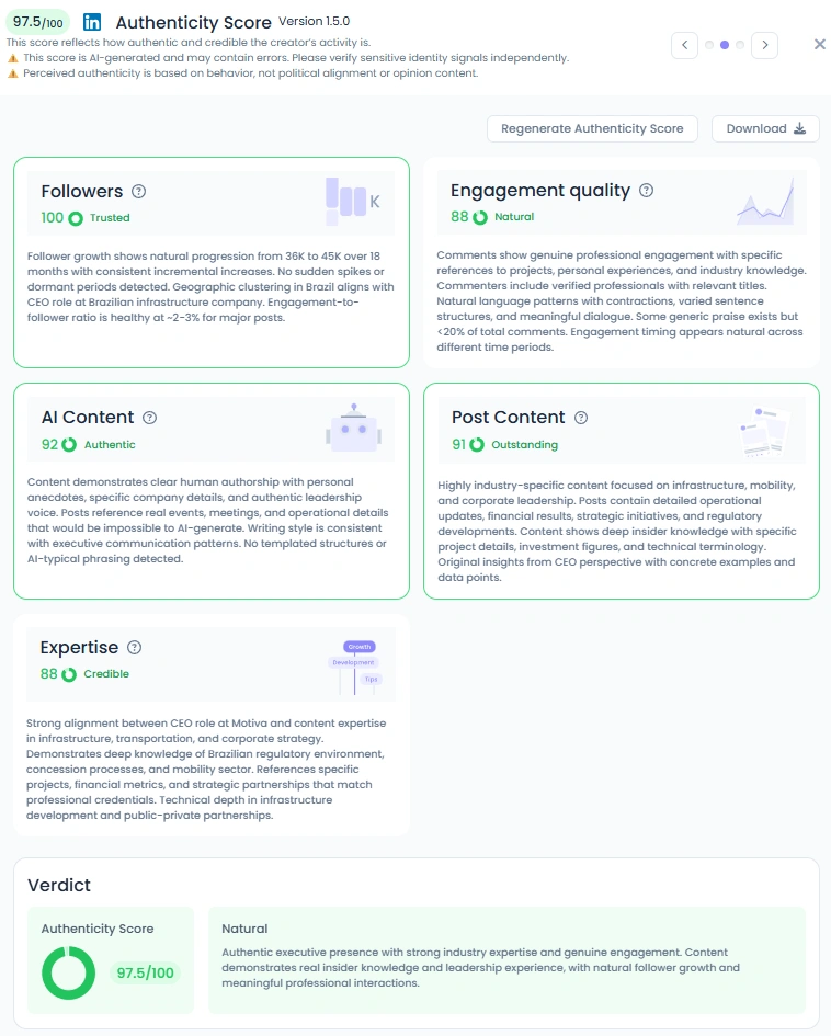 Com uma excelente pontuação de autenticidade de 97,5/100, a Setas prova que um executivo pode ser autêntico e, ao mesmo tempo, manter uma imagem profissional. Seu conteúdo é classificado como Autêntico 92 para conteúdo de IA, demonstrando uma clara autoria humana com detalhes específicos da empresa e voz de liderança. Seus cargos são altamente específicos do setor e destacam-se em qualidade, com foco em atualizações operacionais, resultados financeiros e desenvolvimentos regulatórios. Por exemplo, ele compartilha fotos de marcos importantes, como comemorar uma grande vitória em um leilão ou um acordo significativo de energia renovável, mostrando a face humana das decisões corporativas de alto risco.