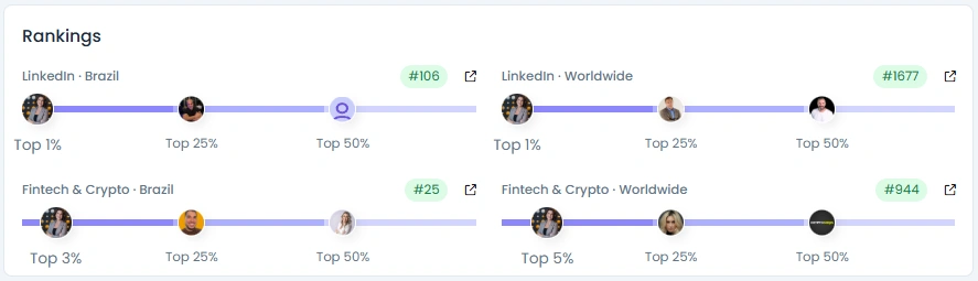 Paula está entre os 1% melhores criadores no LinkedIn Brasil e os 3% melhores em Fintech e Crypto. Seu Índice de Influência chega a 7.565 pontos, mostrando a força de sua reputação profissional. Ela promove regularmente o engajamento em três idiomas, português, espanhol e inglês, conectando-a a um público verdadeiramente regional. Seu crescimento de seguidores e seu ritmo constante de publicação refletem a autoridade de um líder que se comunica com clareza e consistência.
