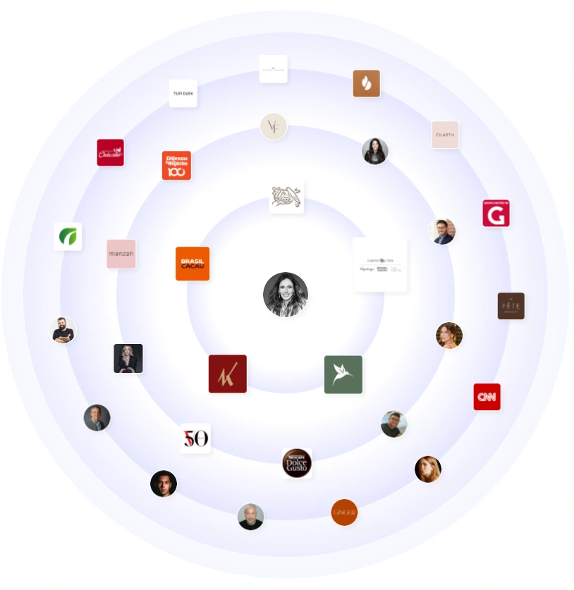 Seu círculo combina os principais meios de comunicação de negócios do Brasil, fundadores de varejo e parceiros de marca. Você encontrará Kopenhagen, Brasil Cacau, líderes de franquias e prêmios de inovação. Existem laços com vozes globais de CPG e imprensa sobre estilo de vida, além de consultores e operadores que escalam lojas. A rede oferece alcance aos consumidores, investidores e à comunidade de varejo.