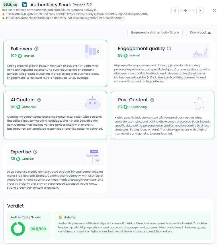 Pontuação de autenticidade do Favikon: 96,5/100. O diálogo em português flui naturalmente com executivos, proprietários de franquias e clientes. As postagens incluem métricas reais, histórias de fundo de produtos e reflexões sinceras após os eventos. Sem respostas modeladas. Apenas liderança estável com gratidão e energia.