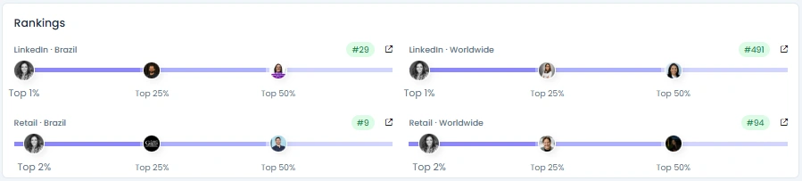 Pontuação de influência: 8.082 pontos. Os seguidores subiram organicamente de 28 mil para 50 mil em quatro anos, sem picos suspeitos. A qualidade do engajamento está em 88%, com conteúdo de postagem em 92 e experiência em 85. Os rankings a colocam em #29 no LinkedIn no Brasil e #9 no varejo no Brasil, com colocações globais em #491 e #94.