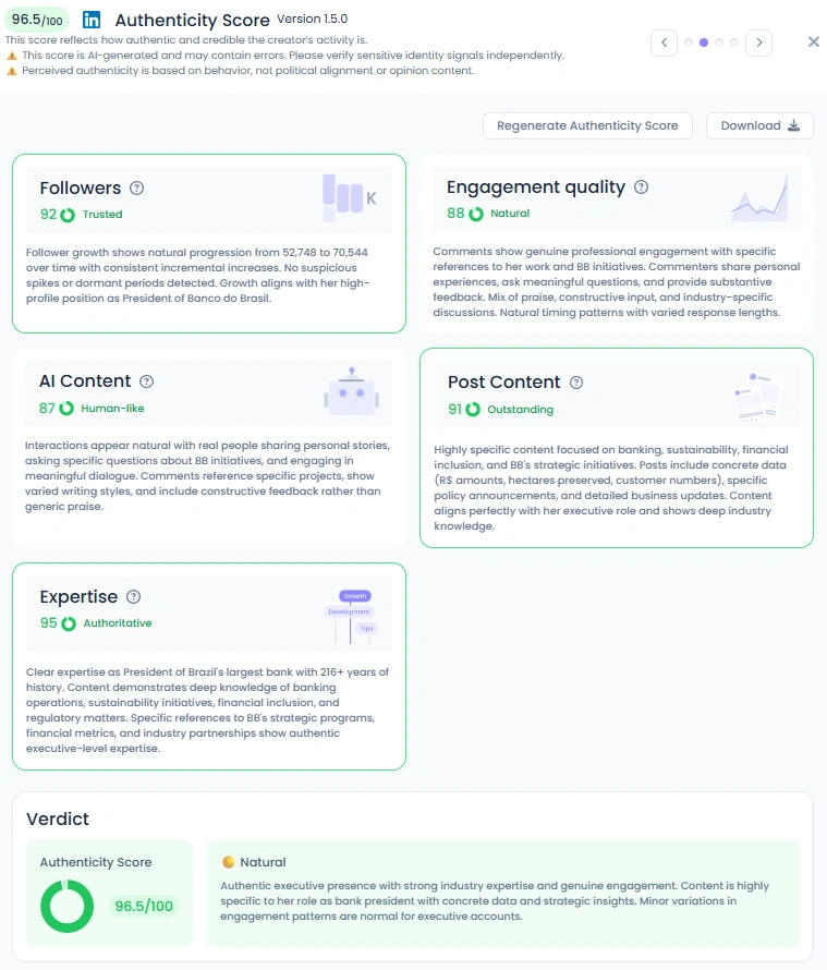 Com uma excelente pontuação de autenticidade de 96,5/100, sua presença on-line parece genuína e atenciosa. Suas postagens revelam interações reais com equipes, momentos sinceros de conexão e seu compromisso inabalável com a equidade. Ela compartilha mensagens sobre antirracismo, empoderamento feminino e inclusão que vão além da retórica, inspirando diálogos construtivos. A consistência entre sua personalidade executiva e sua voz humana é o que mantém seu público engajado.
