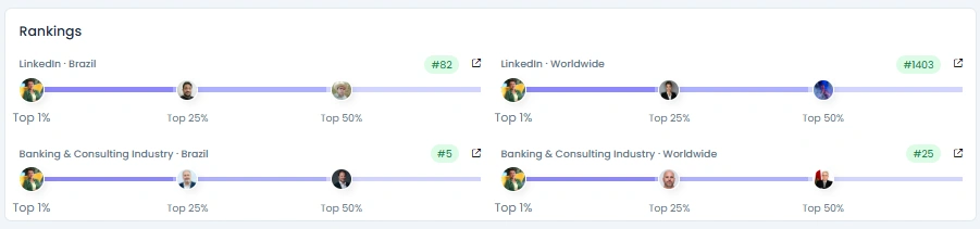 Seus seguidores no LinkedIn cresceram organicamente de 52.748 para mais de 70.000, refletindo um engajamento estável e confiável. Com uma pontuação de influência de 8.132 pontos, ela ocupa a posição #82 no LinkedIn Brasil e #5 no setor bancário e de consultoria. Sua qualidade de engajamento é de 88 (natural), enquanto sua experiência atinge notáveis 95 (autoritária). Essas métricas destacam uma comunidade que valoriza sua visão tanto quanto sua liderança.