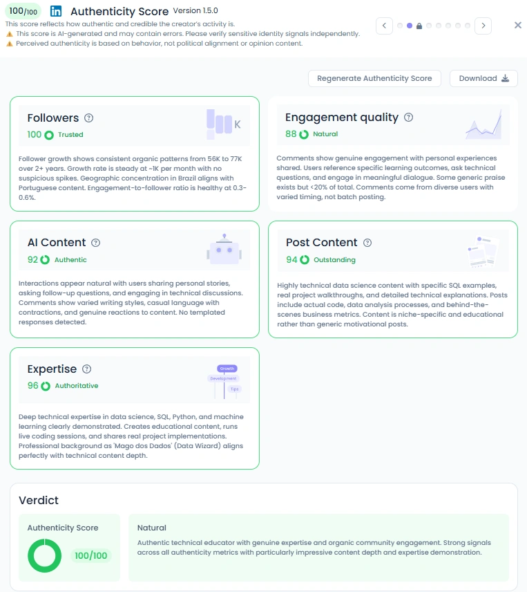 O público de Téo tem crescido constantemente de 56 mil para 77 mil seguidores, com uma taxa de engajamento entre 0,3% e 0,6%, o que é um forte sinal na área educacional. Sua pontuação de influência de 8.278 pontos o coloca entre os 1% melhores criadores no LinkedIn Brasil e entre os 3 melhores em Ciência de Dados. Com postagens consistentes, um forte diálogo nos comentários e uma presença ativa em várias plataformas, ele construiu uma comunidade de aprendizado próspera baseada na confiança.