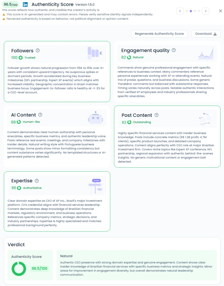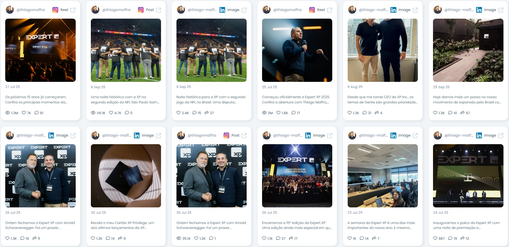 Com uma pontuação de autenticidade de 96,5/100, Thiago atinge um forte equilíbrio entre liderança corporativa e comunicação identificável. Suas postagens são claramente escritas com anedotas pessoais, métricas reais e insights de liderança. O engajamento que ele atrai vem de profissionais do setor, funcionários da XP e colegas de negócios que compartilham suas próprias perspectivas. Embora refinado, seu conteúdo permanece baseado na conexão humana, seja celebrando conquistas ou destacando as pessoas por trás do sucesso da XP.