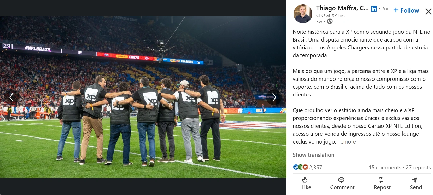 As pessoas prestam atenção a Thiago porque ele torna as finanças acessíveis sem diluí-las. Sua comunicação é baseada em fatos, insights de negócios e resultados reais. Seja revelando novos lançamentos de XP, refletindo sobre a expansão regional ou celebrando grandes marcos com sua equipe, suas postagens ressoam porque combinam autoridade com clareza. O público sente que está aprendendo diretamente da mesa do CEO, não de um roteiro de relações públicas.